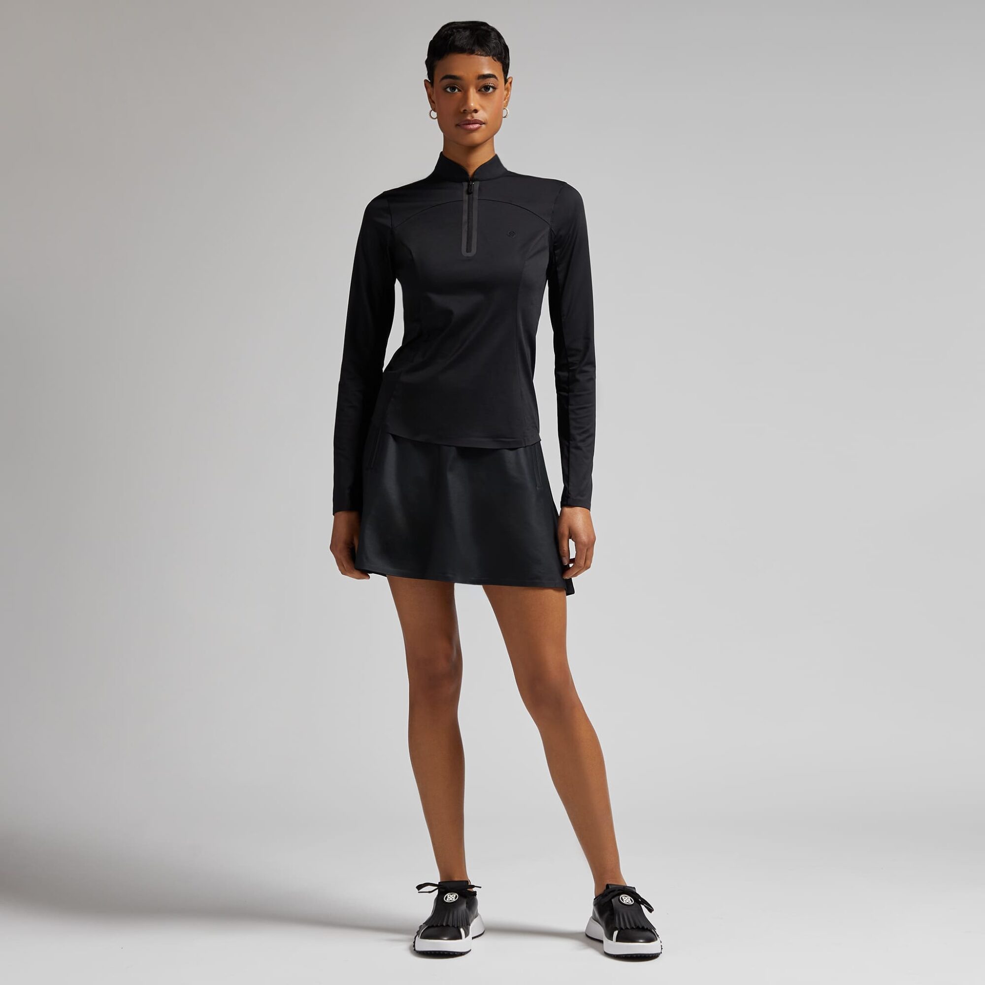 our effortless skort is just that; a go-to skort for every golf round or tennis match. this skort features a built-in short with zip closure side pockets and a single back pocket. our "calendered" material gives this fabric a sophisticated but subtle sheen while on the course. offered in standard 15" length and longer 17".