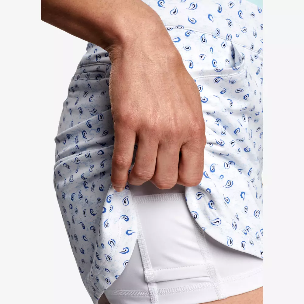 this printed golf skort is made from a two-yarn, four-way stretch fabric that wicks moisture to keep you cool and comfortable on the course. upf 50+ sun protection keeps you covered during long rounds. finished with quarter-top pockets, an attached shortie and a petal hem.