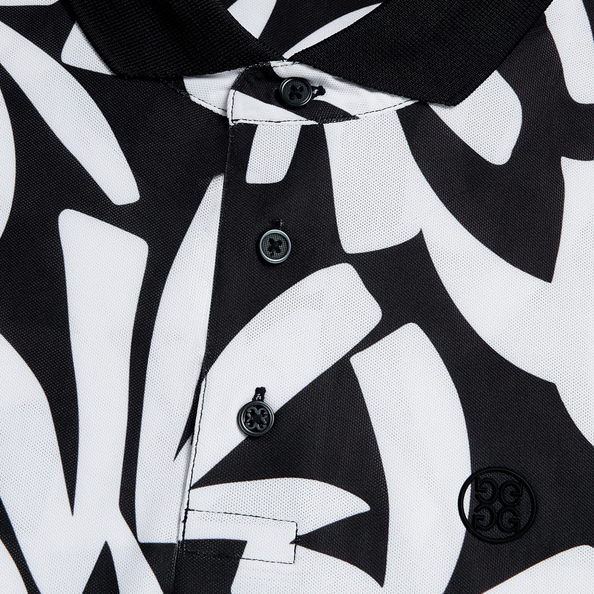 this moisture wicking tech piqué polo features a spread collar and 3 button placket in a contrasting knit. boldly covered in an all over palm print, it's a classic silhouette with banded short sleeves and a tennis tail hemline for ultimate performance on the course.