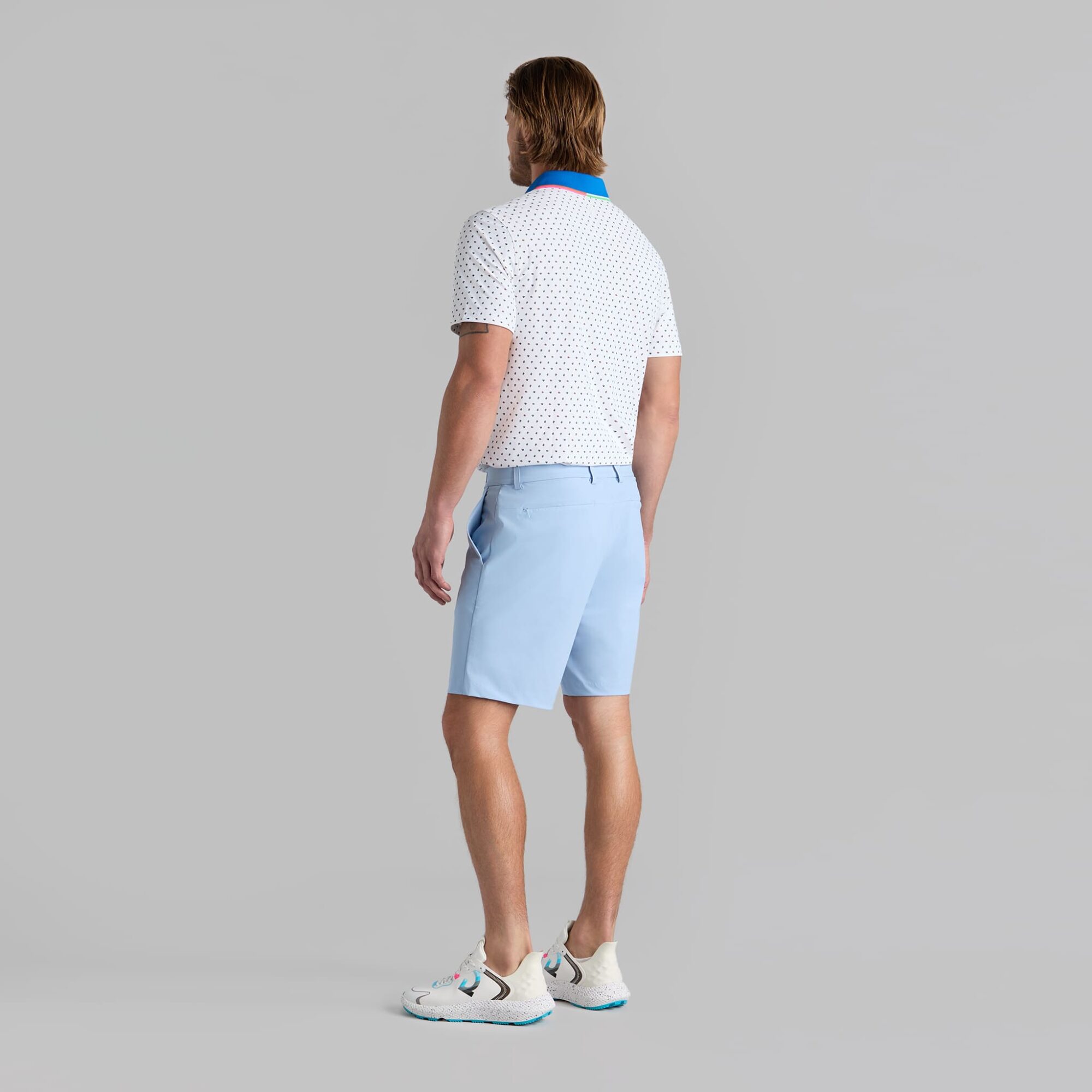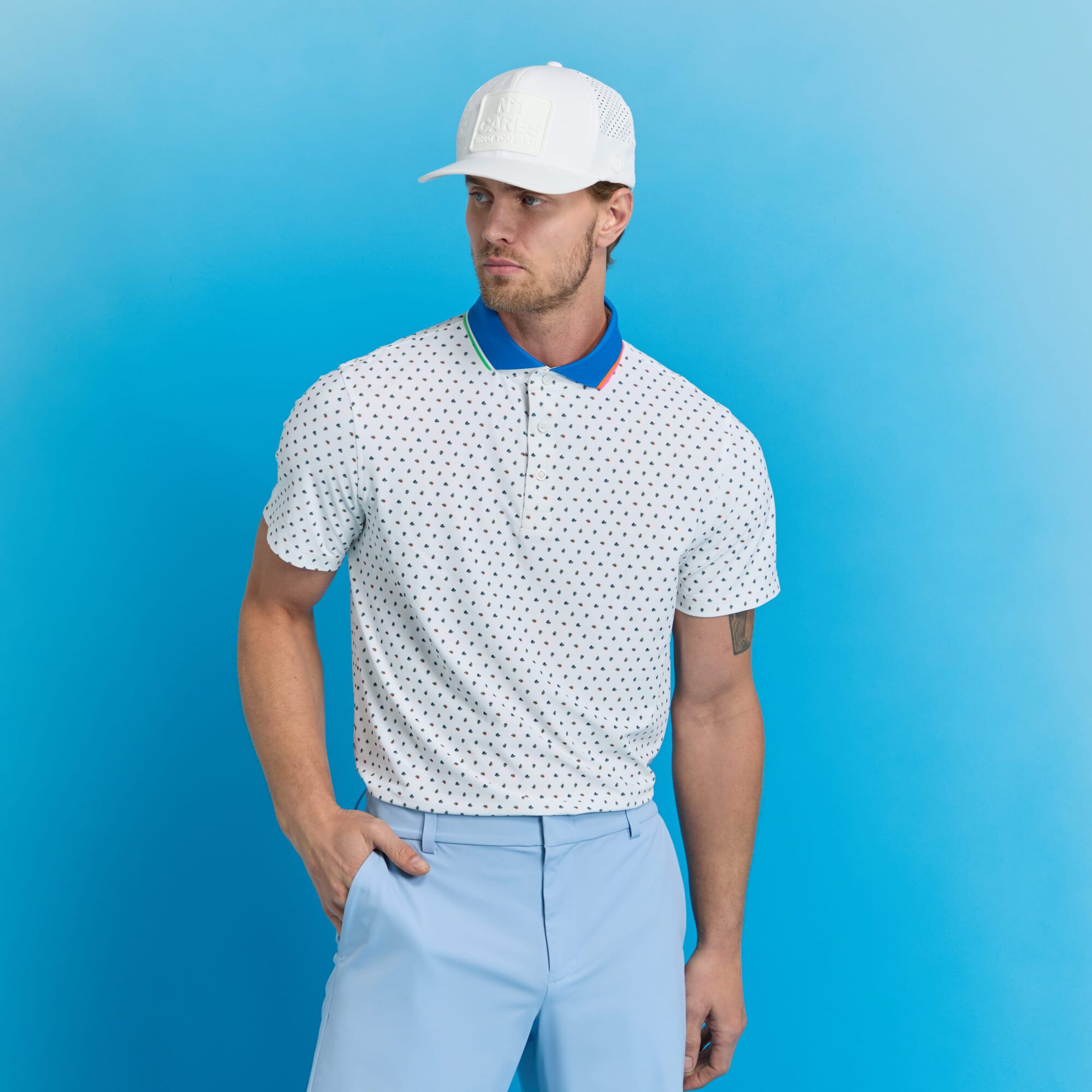 featuring our ditsy floral print, this tech piqué polo is the ultimate everyday essential for days at the clubhouse, the course, and in between. made of breathable tech piqué fabric with moisture wicking benefits and unbeatable 4-way stretch, it's a must-have for any golfer's closet. tuck into a pair of our tour 5 pocket pants for an effortless look on the greens.