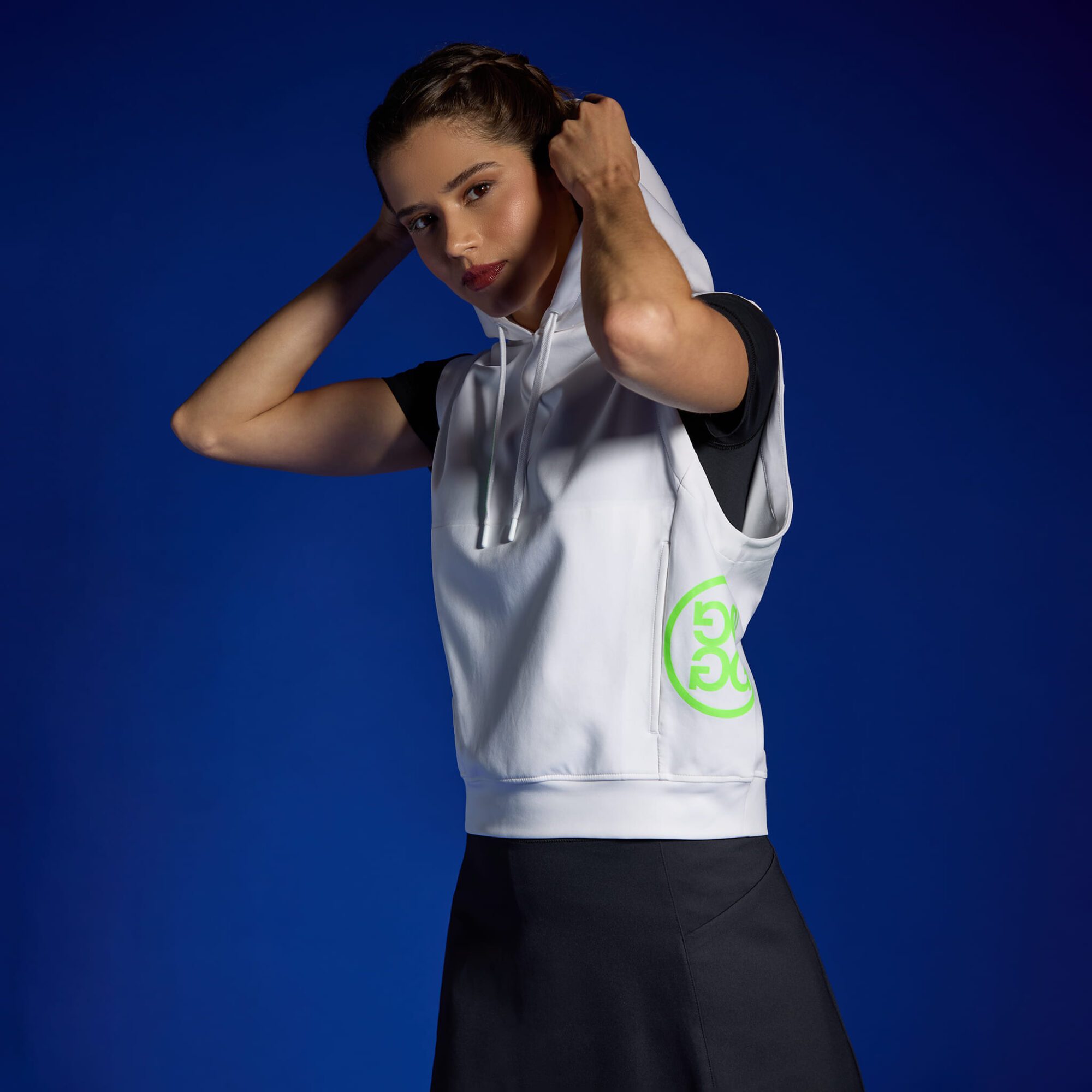 comfort isn't underestimated in this cropped sleeveless hoodie. made of 4-way stretch nylon that's extra breathable and odor inhibiting, it's great for any activity in an effortlessly relaxed fit. from everyday to exercise to lounging, this comfy style pairs well with a jogger style pant and our g.112 street shoes for a pop of colour.