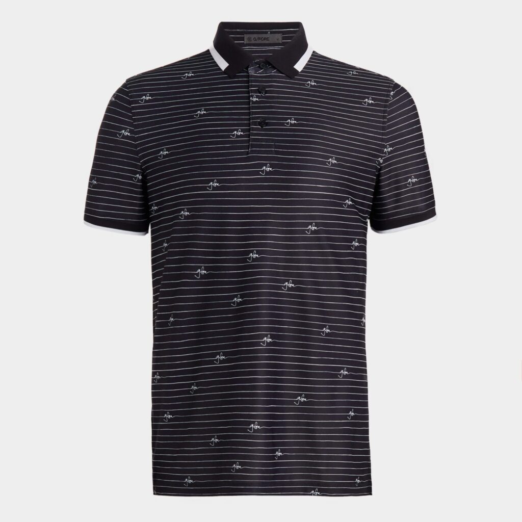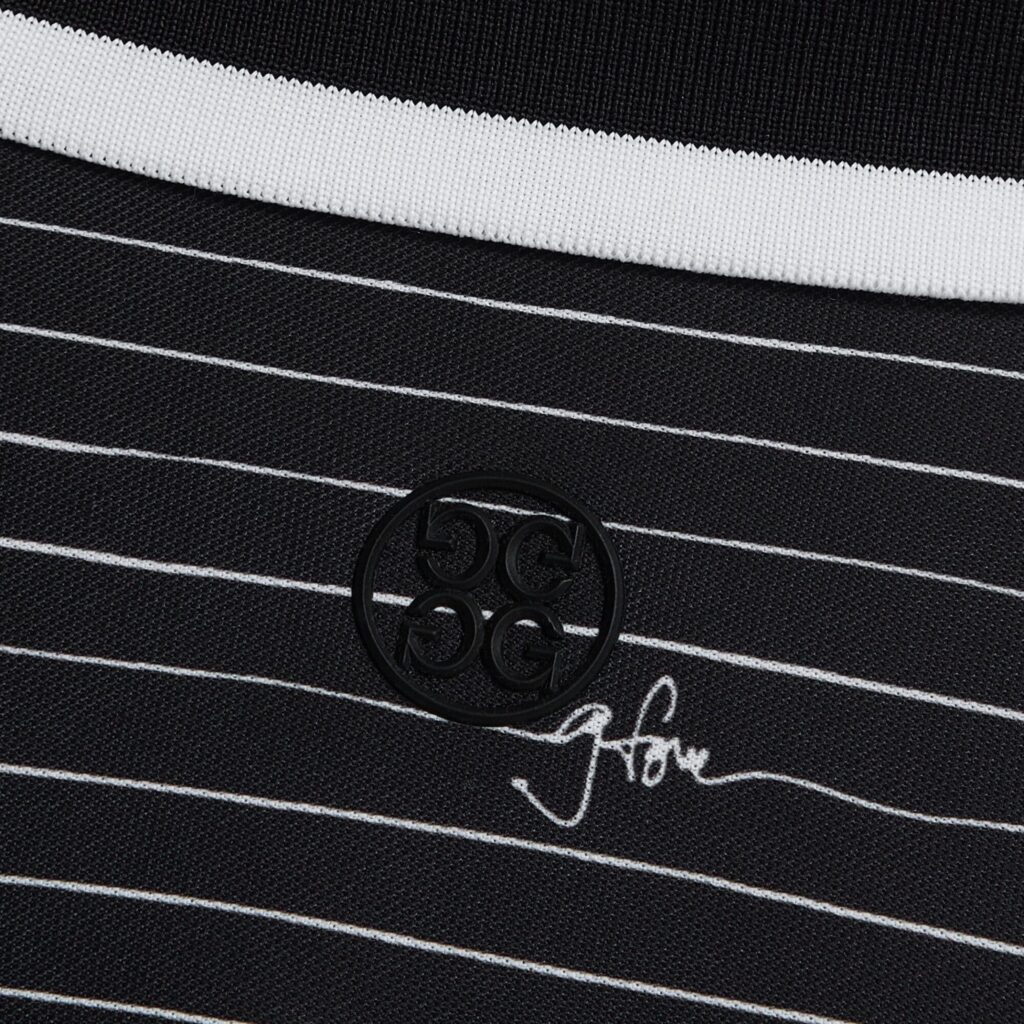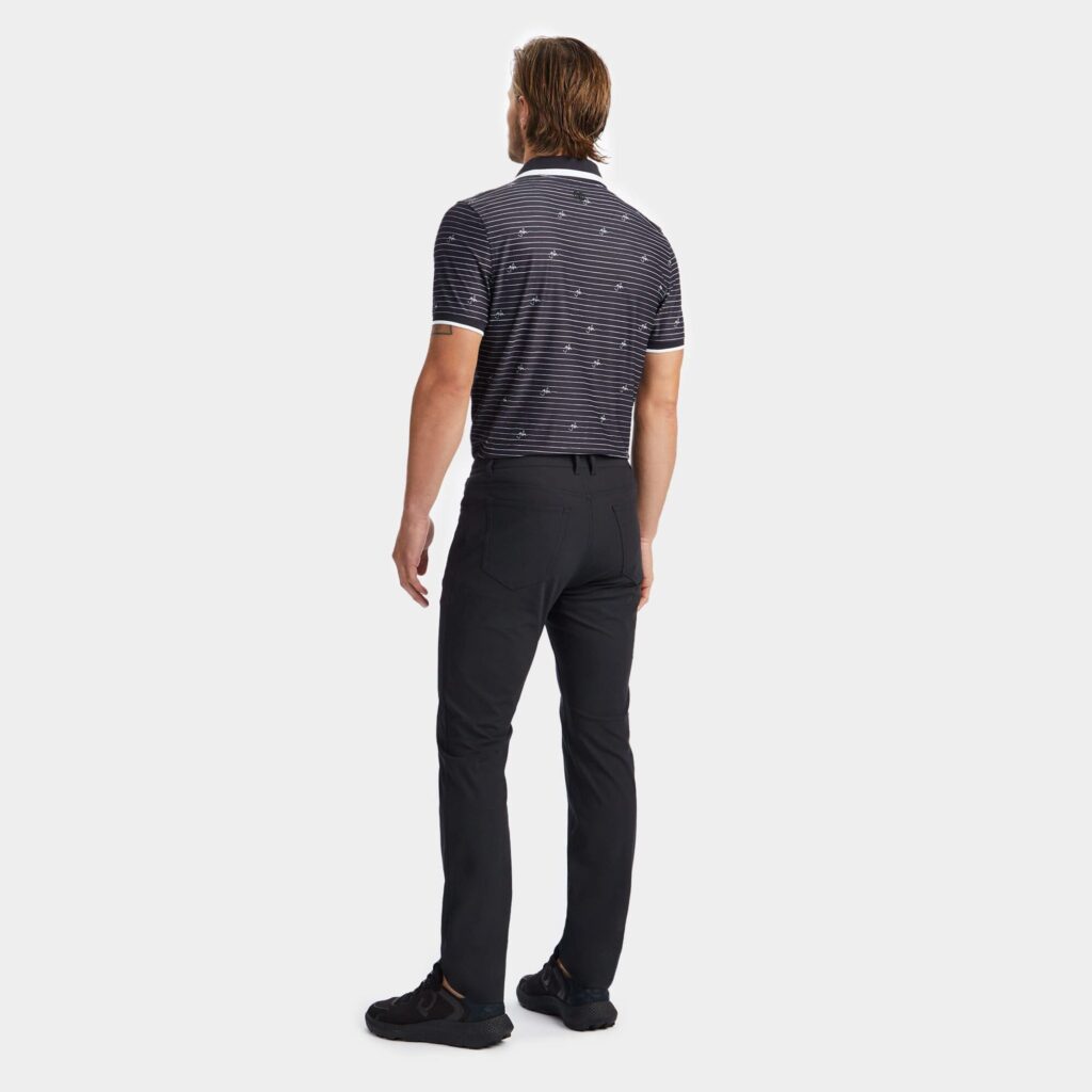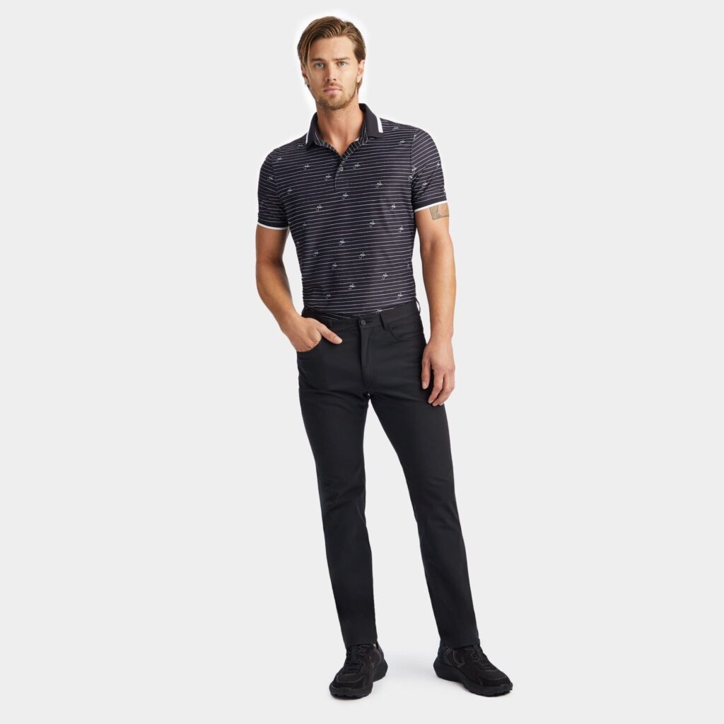 cut with a collar and banded sleeves in a contrasting stripe knit, this tech piqué polo is moisture wicking with flexible 4 way stretch. it's a golfer's staple with style and versatility, pairing well with the tour 5 pocket 4-way stretch straight leg pant.