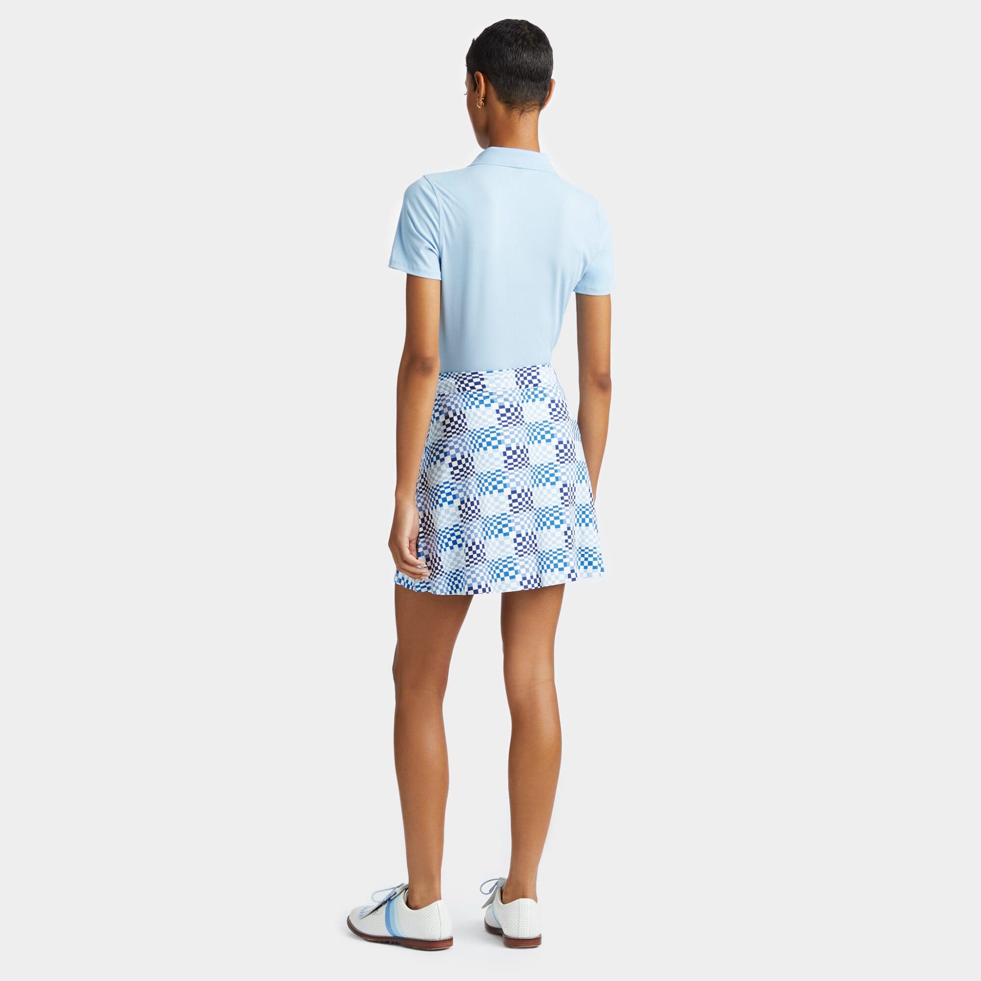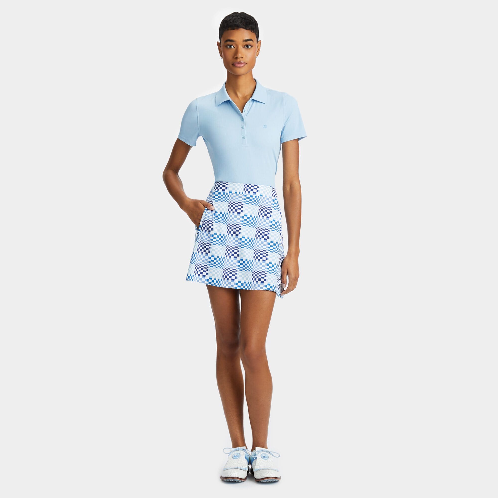 inspired by our best-selling effortless skort, this sophisticated silhouette is the perfect pairing piece for any complementing top. the trending mini skirt features interior silky tech nylon shorts equipped with cooling and moisture wicking properties for all day comfort.