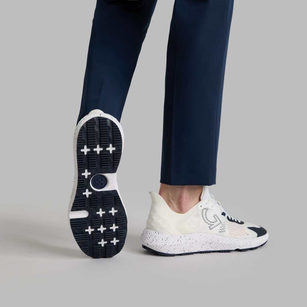 the modern g.112 golf shoe has a sleek silhouette and low drop design to enhance your connection to the ground. equipped for optimal grip with heel-to-toe turf traction, it's the go-to shoe for all day play with a comfortable eva midsole and mesh lining. wear with one of our straight leg pants and classic polos for a look that works on the course or at the clubhouse.