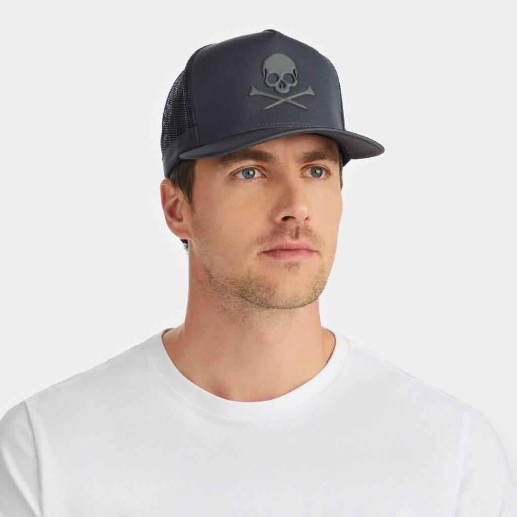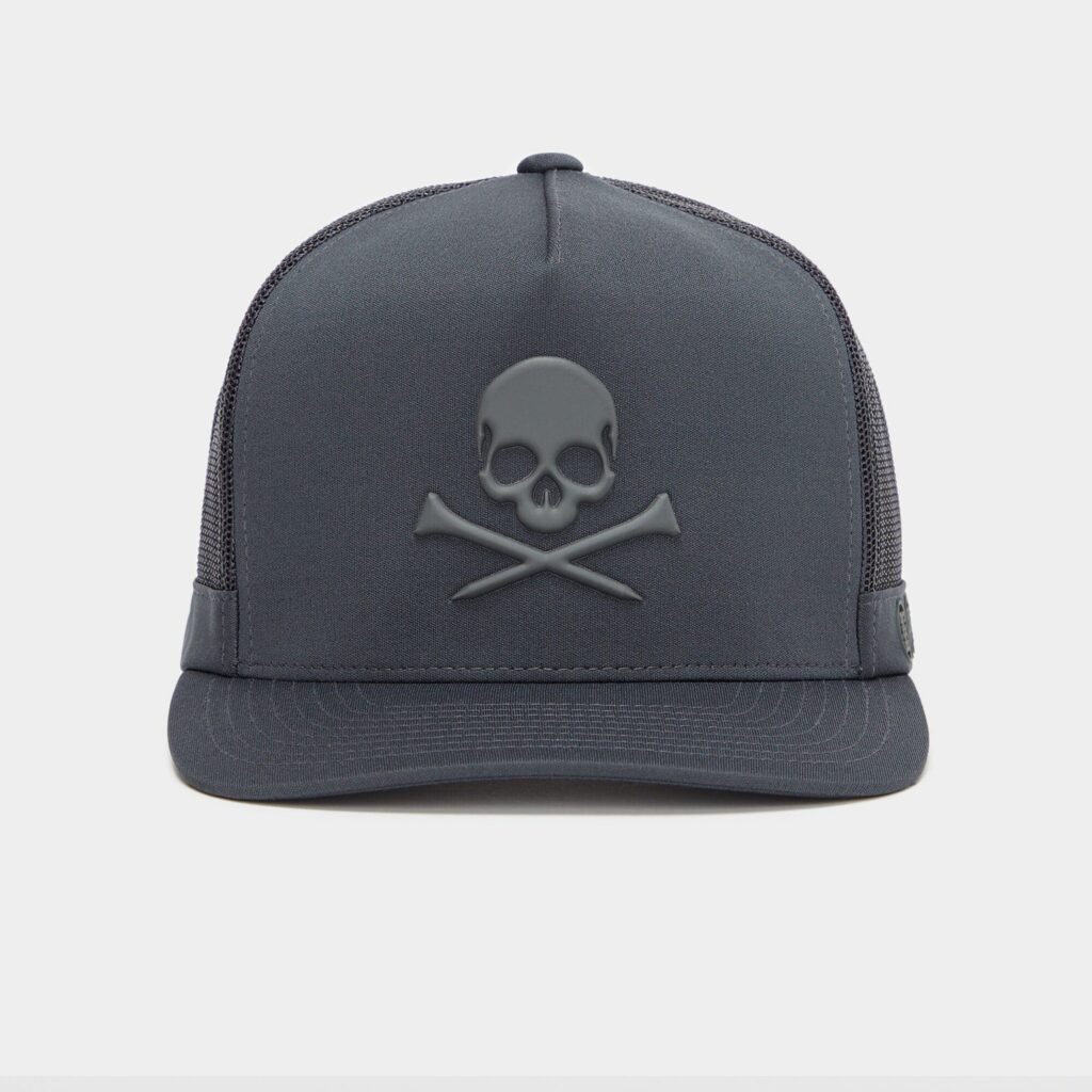 featuring a smooth silicone skull and tees emblem on the front, this trucker style hat is made with breathable mesh and tech interlock. designed in staple colours for easy pairing, it's a favourite to beat the heat during hot days on the course.