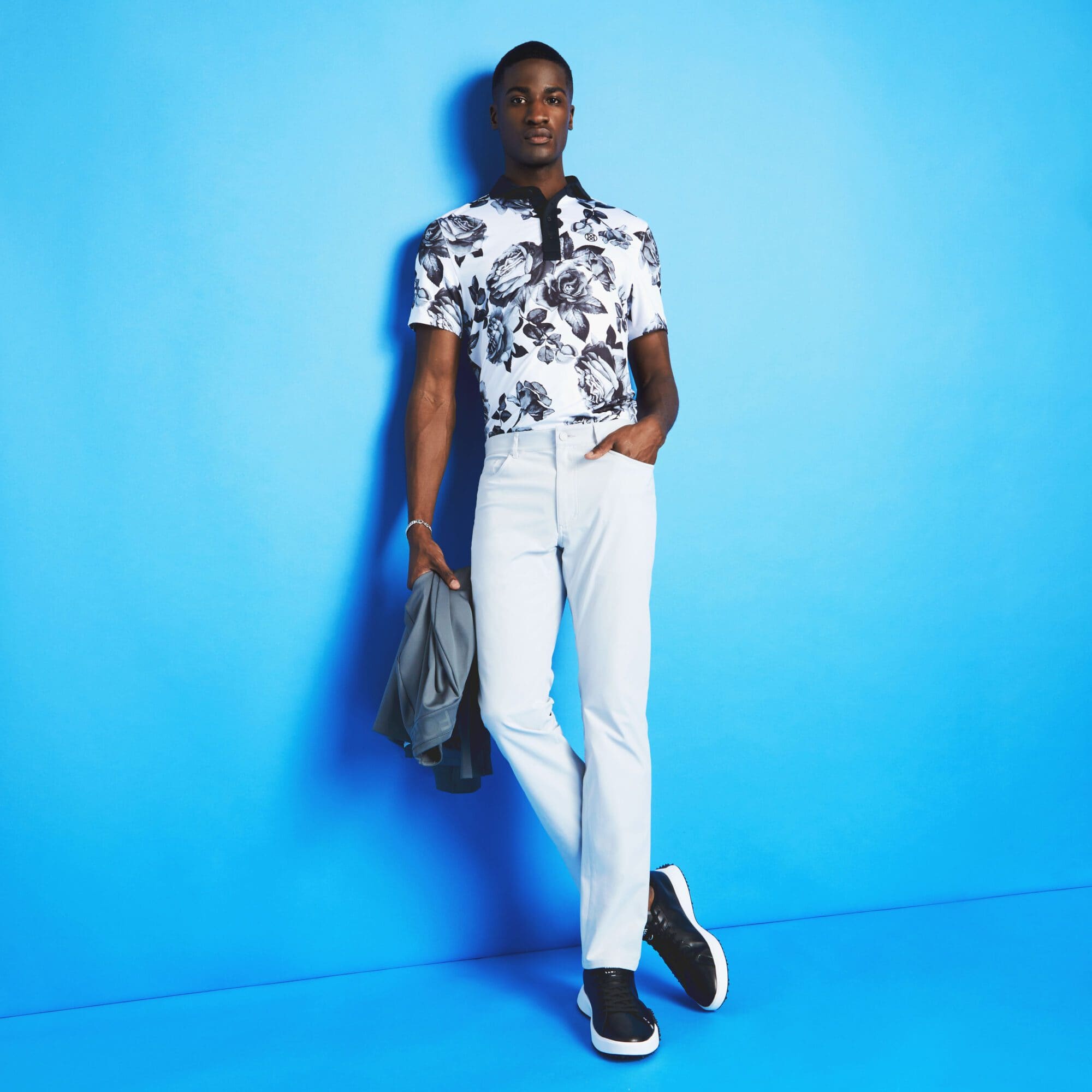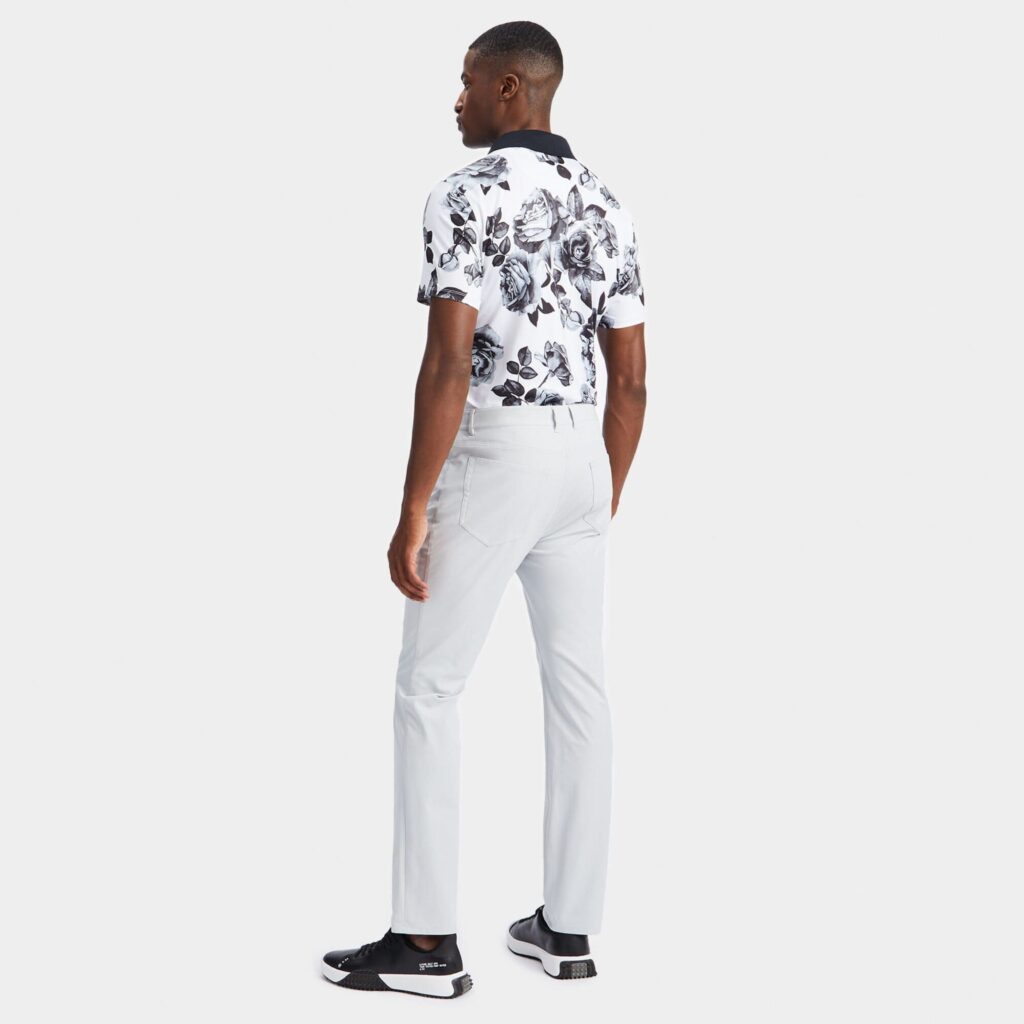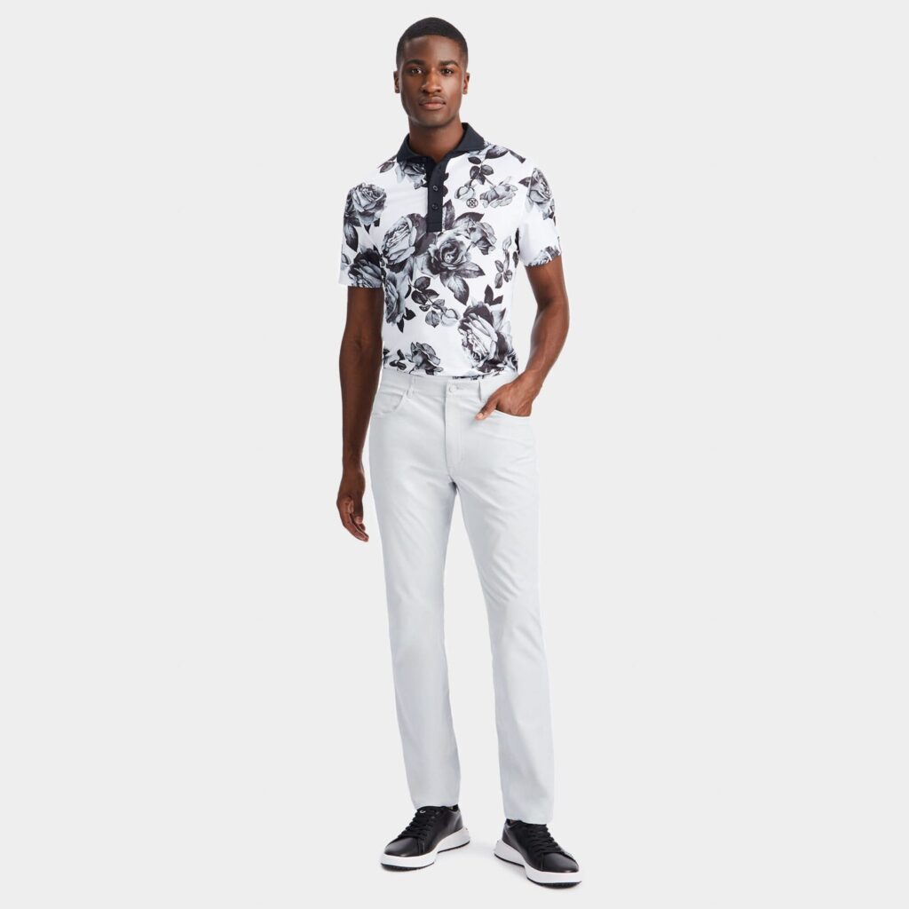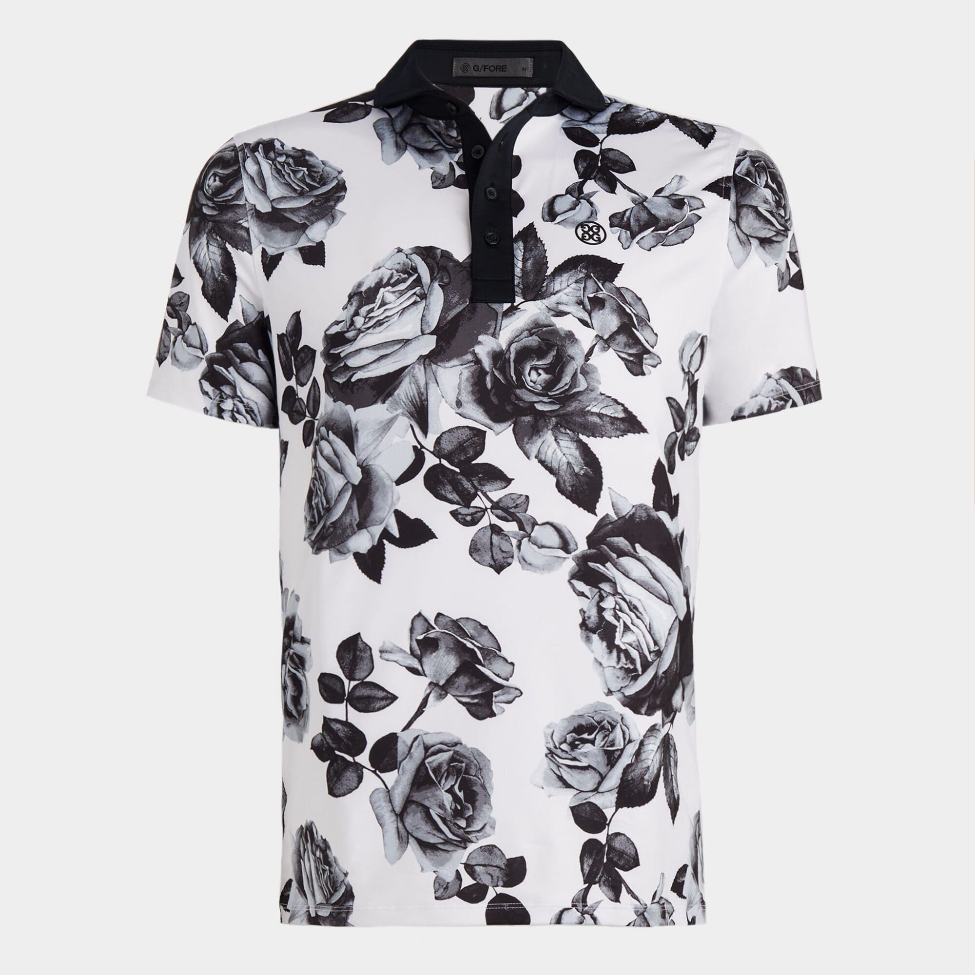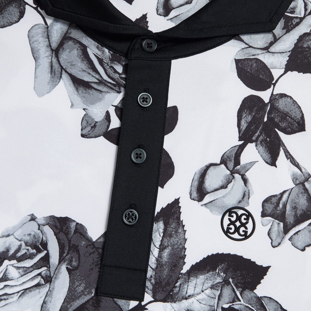 this moisture wicking jersey polo features a spread collar and 4 button placket in a contrasting knit. it's a classic silhouette updated with bold florals designed for ultimate performance.