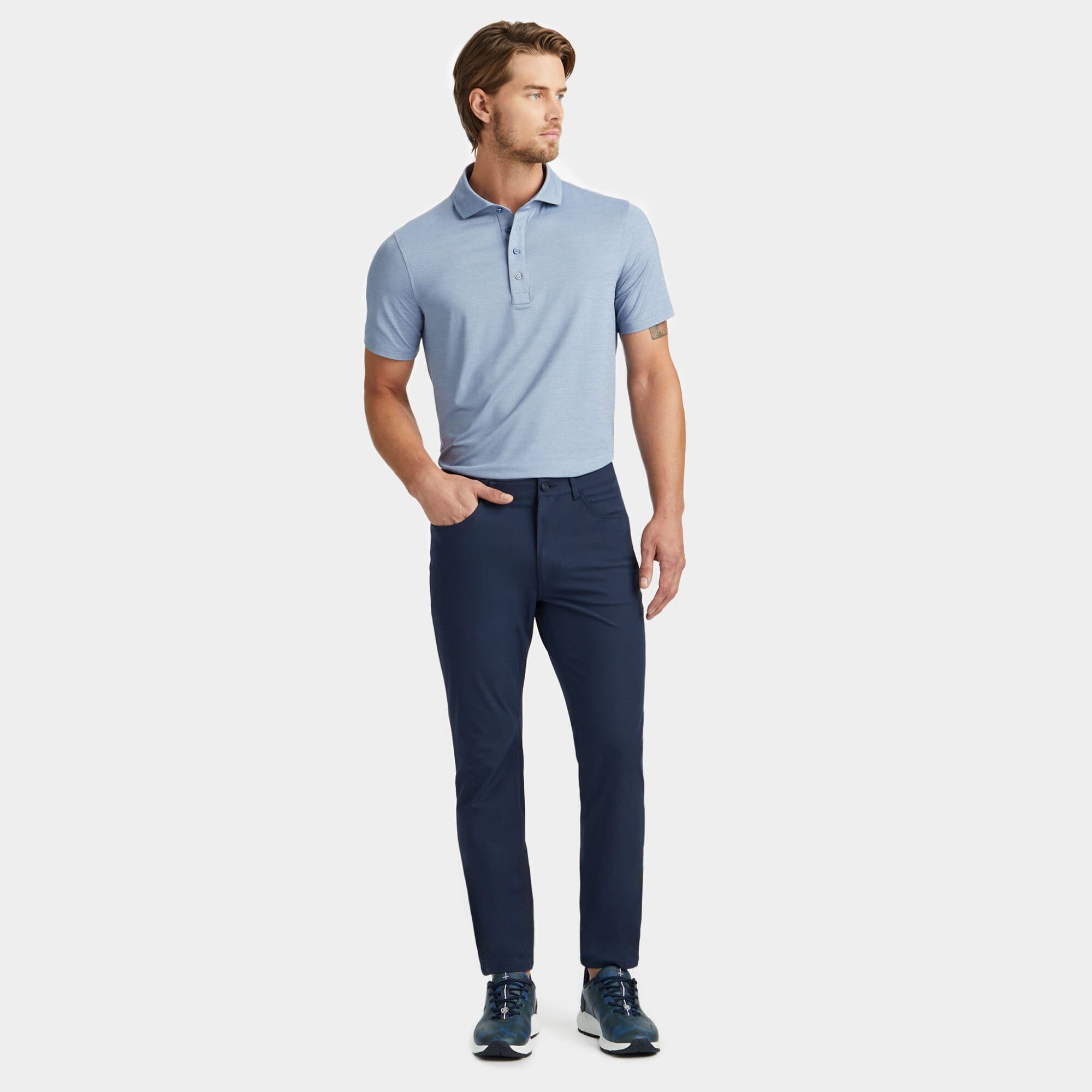made with cooling and moisture wicking mélange ice nylon with 4-way stretch, uv protection, and antimicrobial properties, this short sleeve polo can handle it all—so you won't have to. the ribbed gusset details provide extra breathability as well. set your swing up for success with this classic wardrobe staple.