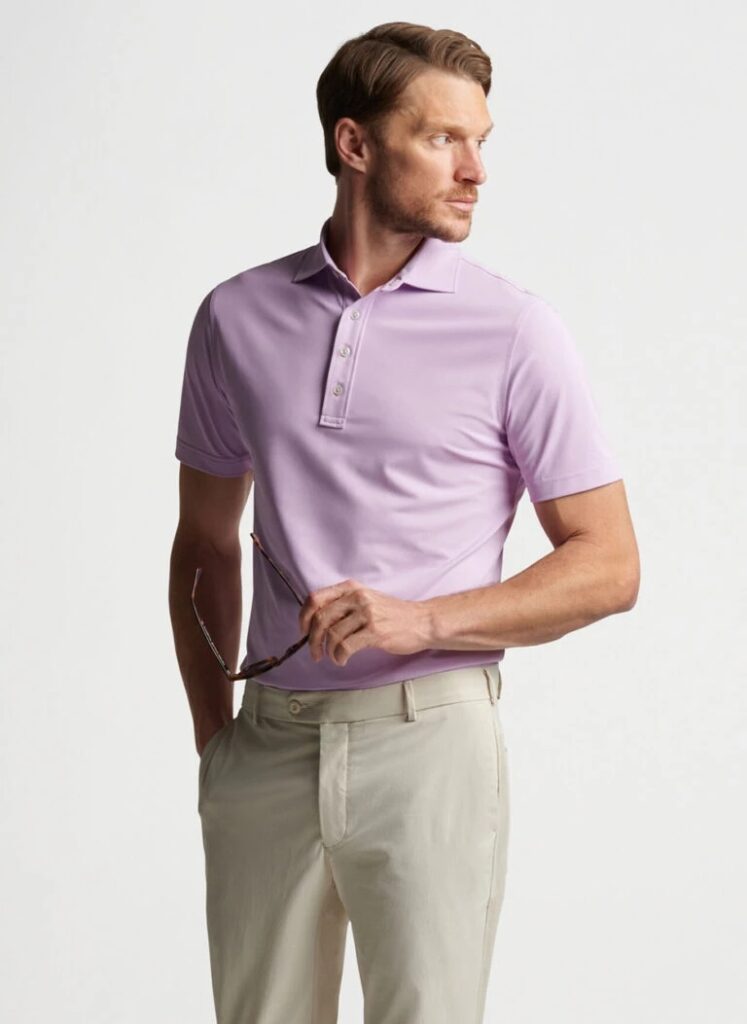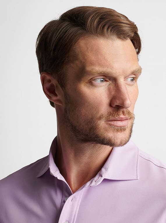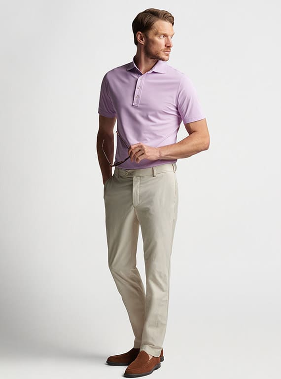 a stylish spin on our classic performance polos, this essential thrives on or off the golf course with a moisture-wicking mesh fabric, four-way stretch and easy-care. vintage-inspired collars and four-button plackets recall the golden age of golf style, while luxurious mother-of-pearl buttons provide an elevated touch.