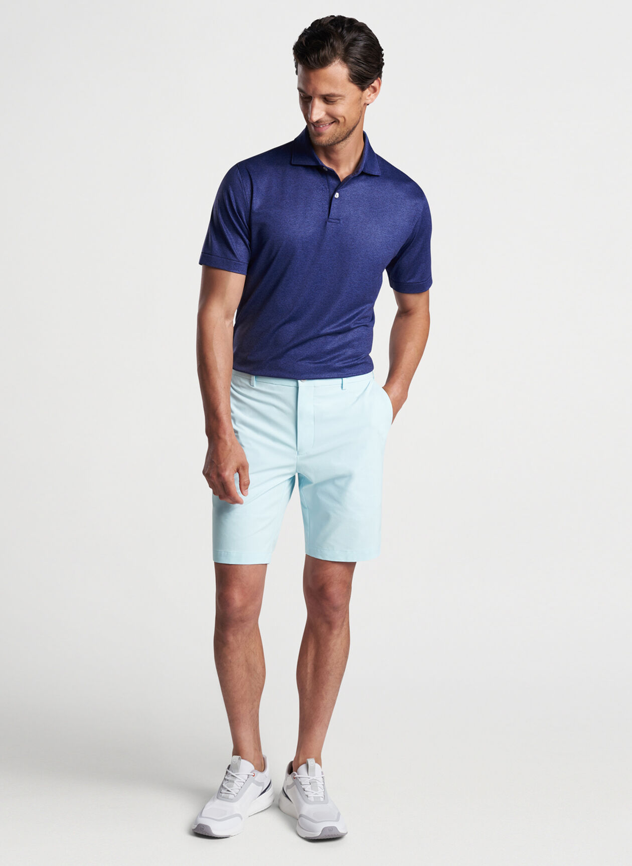 the surge short delivers the technical benefits of performance apparel in a streamlined silhouette made for days on the move. designed with water-resistant protection, maximum four-way stretch and wicking ability, and a lightweight fabrication that resists wrinkles. offered with a 9" inseam.