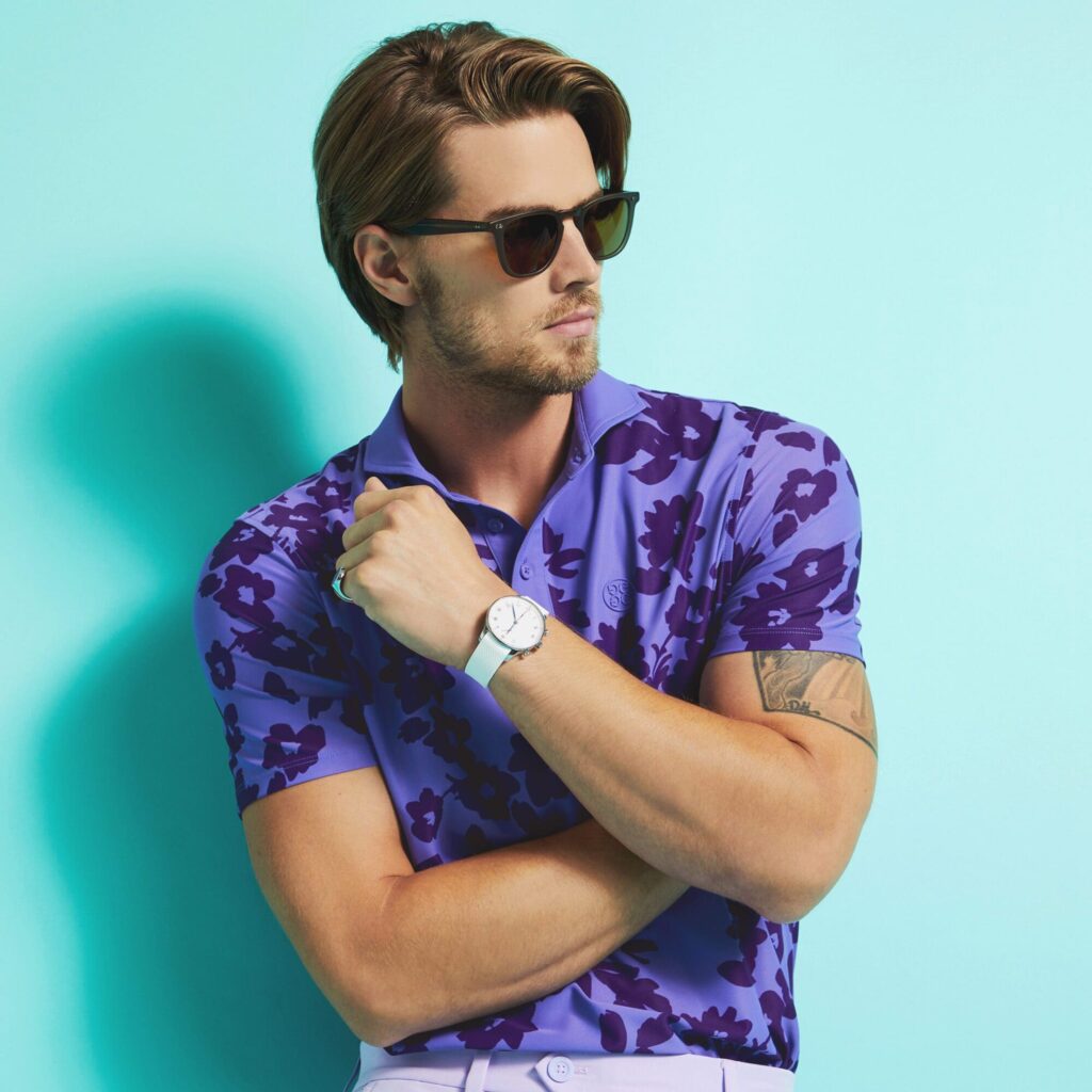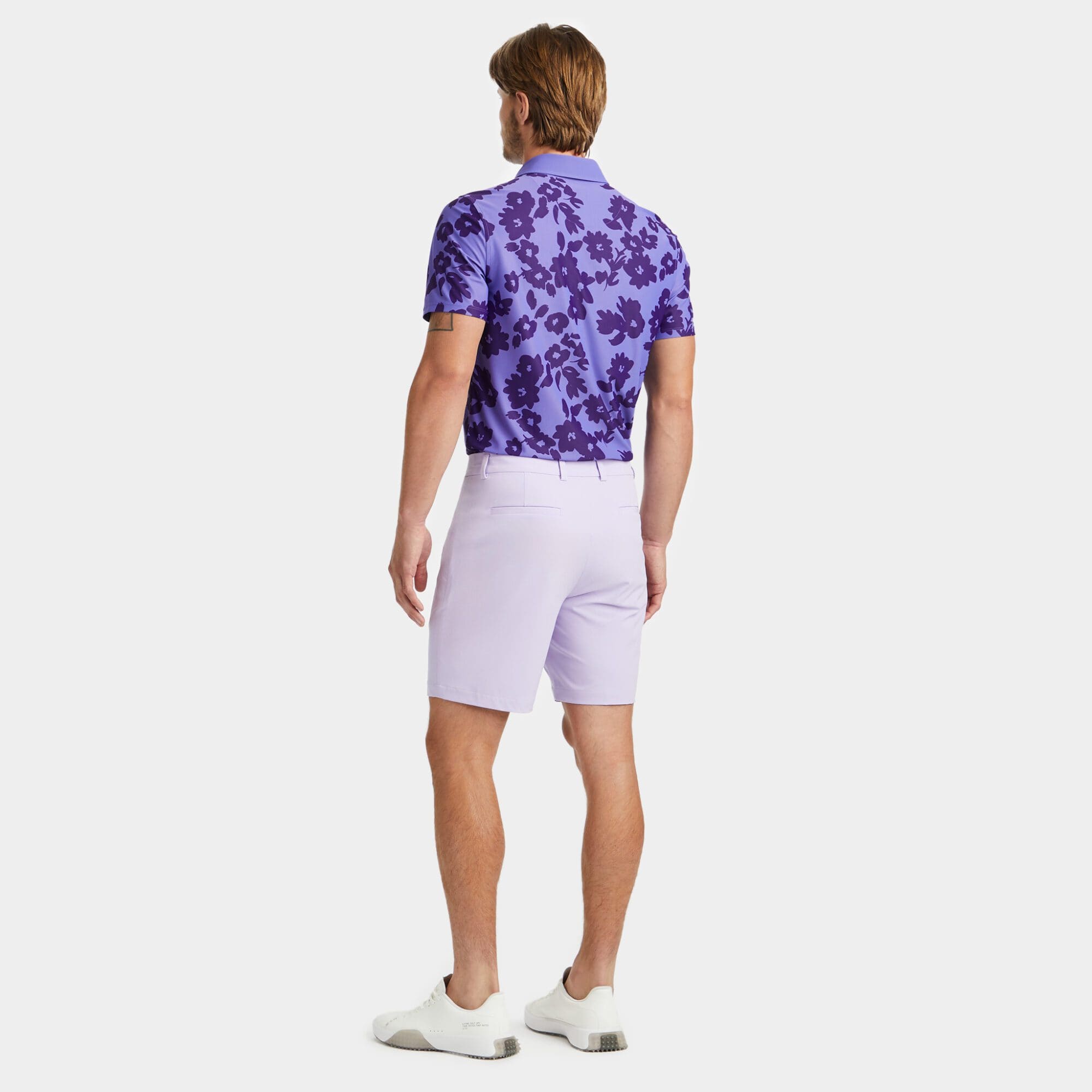 this moisture wicking tonal floral tech piqué modern spread collar polo features a spread collar and 4 button placket surrounded by an all over tonal floral print. stay at the top of your game with this classic silhouette designed with 4 way stretch and a tennis tail hemline—extra mobility included.